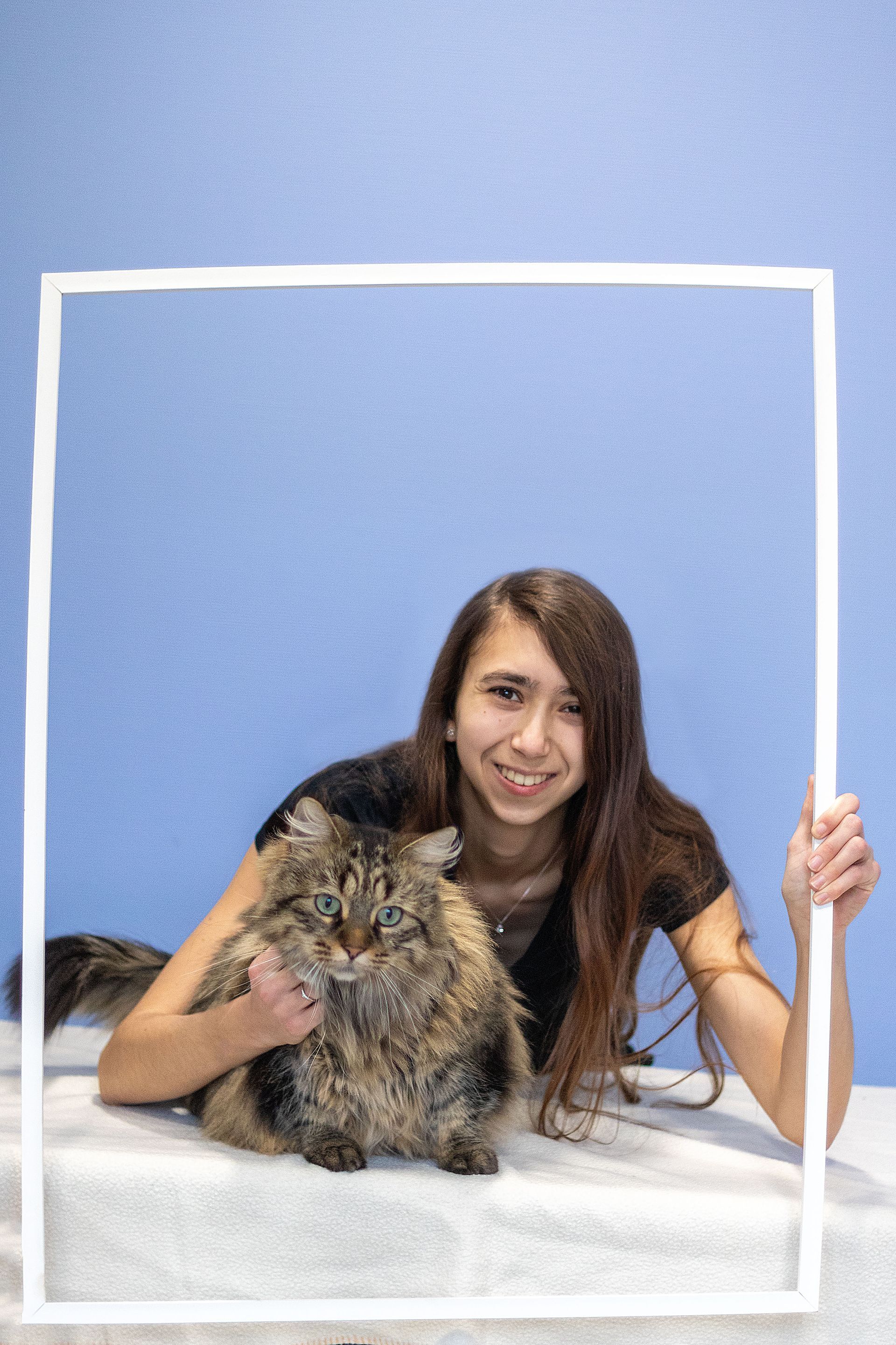 Je suis accompagnée, sur la photo, de mon adorable et câline petite minette rousse et blanche. Je vis également avec un autre chat et un lapin. Je pratique l’équitation depuis l’âge de 5 ans.